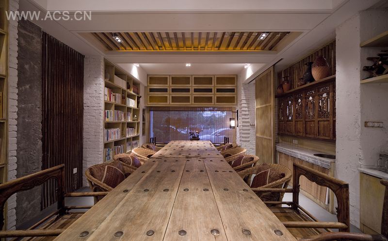 书吧设计最大的特色在于设计师对狭小有限空间的利用与分割,两间通透的门面房被设计师划分的立体空间发挥到极致,立体空间的营造使空间更贯穿,中庭结合楼顶光线分割造景与天井结合一气呵成。