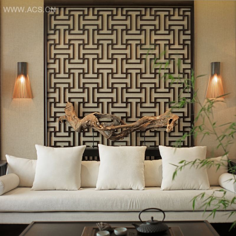 生活本身就是艺术创造的基础,唯有把生活本身当成艺术创造和审美的过程,才能彻底领悟生活的意义。此项目样板间就是设计师为提供给主人以修心养性、及收藏会友所量身定做的私人场所。空间以传达轻松、舒适、放松的氛围为目的。推门而入,“绿竹入幽境,青萝拂行衣”,这全靠两旁的木质格栅所营造出的氛围。这个木质格栅的设计灵感来源于竹子,设计师借用竹节的形式,设计了这种木质格栅的样式。脚底的踏石加上青嫩的竹叶、带给人一种自然亲切、平静放松的感觉,悠闲、随意的生活意境尽显眼底,浓郁的东方禅意气息随之而来。