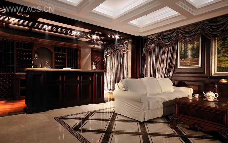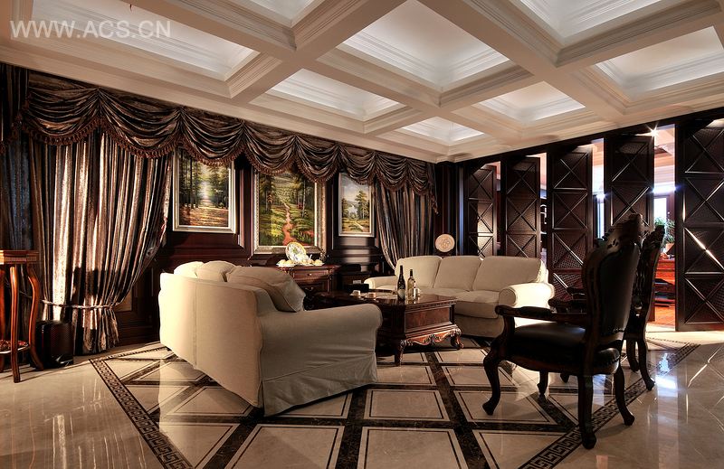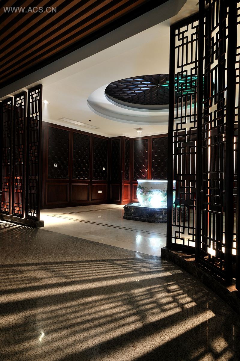 此办公室空间中体现的中式风格是独特的,在具有一定的传统中式风格下又不失时尚、华贵的装饰性。在重新研究并总结了中国传统设计中的装饰元素后,变形重组运用。在地面石材的设计中,将中式传统吉祥图案进行变化,运用石材水刀切割技术和手工打磨技术铺贴于重要空间饰物地面上,从而产生一种极具富贵气质的震撼效果。进门碧波荡漾、脚踏祥云,设计取色则以深色彩为主,并以大量东方底蕴的吉祥元素衬底,展现中国式的意境氛围。