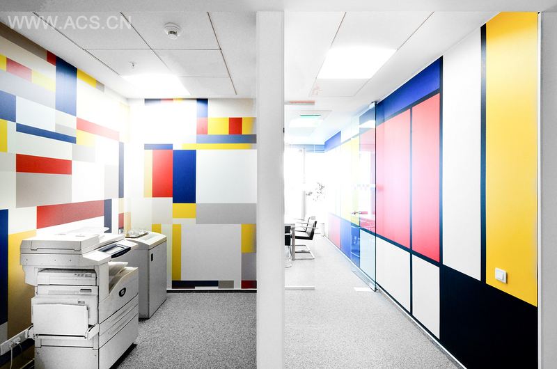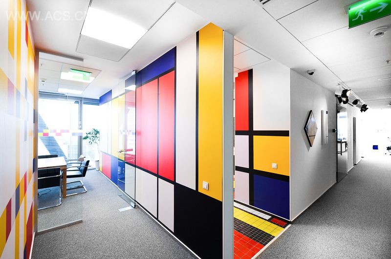 罗马尼亚ING银行办事处的6楼,基于它的荷兰出身和它的戏谑和严肃,我们选择了德斯太尔抽象画派作为创意的来源。我们通过改变座椅高度和靠背躺椅建立蓝色座椅的翻版,从而满足我们会议室座椅的需要。走廊推出蒙德里安的画作复制品,基于原尺寸和技术。该陈列和布光使人想起了一个艺术画廊。