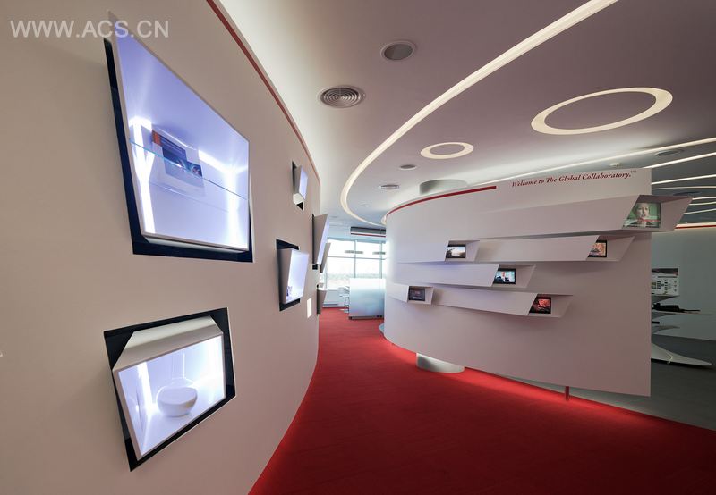 - Entrance area where expressive turbulent walls with screens and exhibits welcome visitors. The central made of Corian flies apart into five touchscreen displays corresponding to five principal business lines of the company. To the left one can see a curved wall running through the whole interior with exhibition cases sprouting out of it.