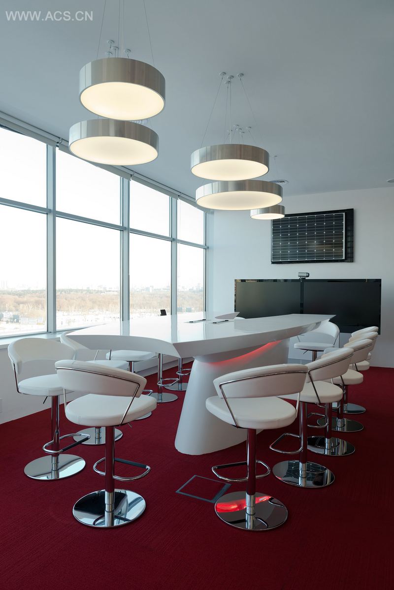 The design is d on the idea to create a high-tech space that will encourage creative and business activity, as well as provide a glimpse of future. We aimed to highlight the fast-moving nature of the company, its focus on scientific development. This is the reason for the dynamic shape of the installation with screens which comes first when you enter the room, the shape of showcases and the overall interior arrangement.