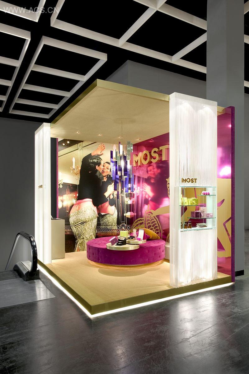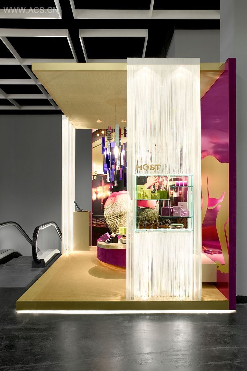 MOST展区的紫色和金色造就了其和谐的外观。展台温暖的散光与背部打光的线型窗帘形成美妙的对比。