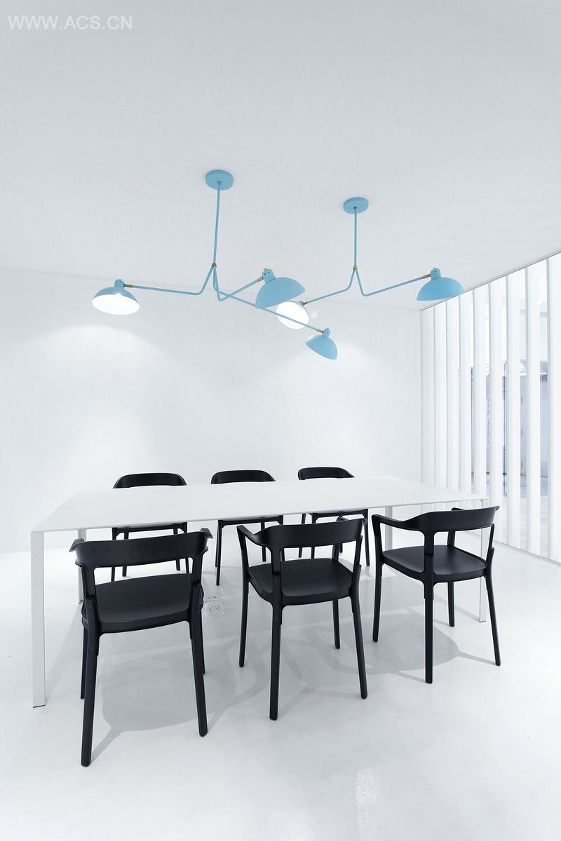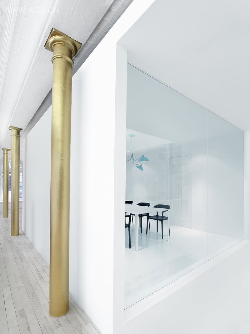 该项目的主要挑战是确保每一个工作区域都利用来自14个拱形窗户的自然光。会议室加到了办公室的中间作为一个白色造型模块。房间连接楼梯,可以把人们带到利用大玻璃墙做成的地下室。在楼梯底部,一个超大的绿松石图片应用到墙上,但是从楼上也可以看到。每个区域都是围绕着中间房间而建立:工作站,图书馆以及休息室,每个地方都紧密联系在一起。