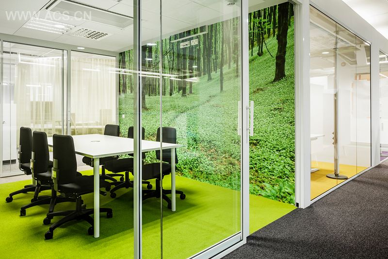 工作区和会议室组成了中心区域。圆的沙发家具作为一个正式的和非正式的交汇点。