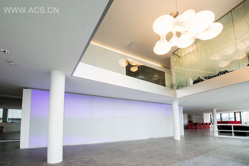 The entrance area in its generosity and with the light and open structure is characteristically for the architectural concept of the building. The wall on the opposite of the entrance is covered with luminous textile panels which show different films and generate different light atmospheres. They also have an acoustic effect, which was very important. So a unique, atmospheric entrance area with surprising effects arises to everybody who enters the new office building of IFN/ Internorm.