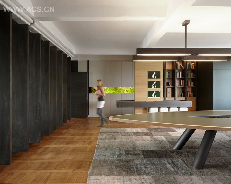 In the staff Cafe on the same floor, one feels like being on the inside of the Trojan horse, the agency’s famous logo. It is an entirely wood-clad, comfortable space for informal conversations over a tea or coffee, which so often creates the spark for big ideas. A reference to the Trojan horse is also found on the first floor, which provides new offices for the accounting department. The communal area, a long-stretched open corridor, accommodates anything from dog houses and copy machines to meeting tables in a furniture sculpture that can easily be interpreted as the track of the Trojan horse, the structure needed to keep it going – much like the accounting to the agency.