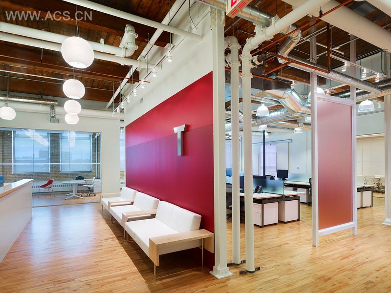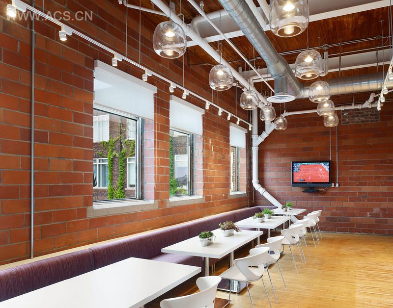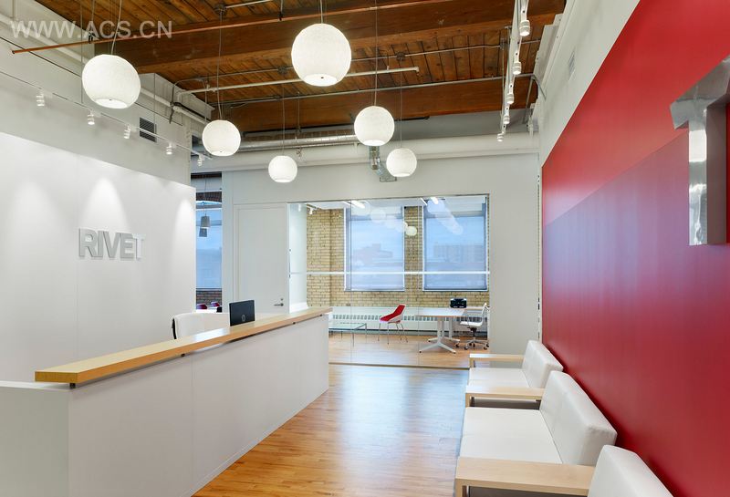 A staff lounge just beyond Reception features a huge red 5-ft drum shade and comfortable seating for informal staff meetings. Key areas in the open plan space are defined with translucent Imago panels. Well-maintained yellow brick walls are prominent as are polished wood floors. The serene white boardroom for pitches features a Tectum ceiling for acoustic enhancement.