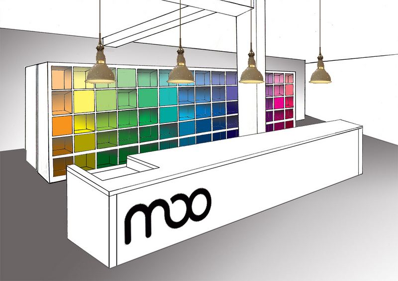 通过运用强烈的色彩,新颖的设计和简单的手法,我们使MOO的艺术特征表现了出来。接待区域也是一个互动的展示厅,员工和游客可以亲身体验MOO的产品。