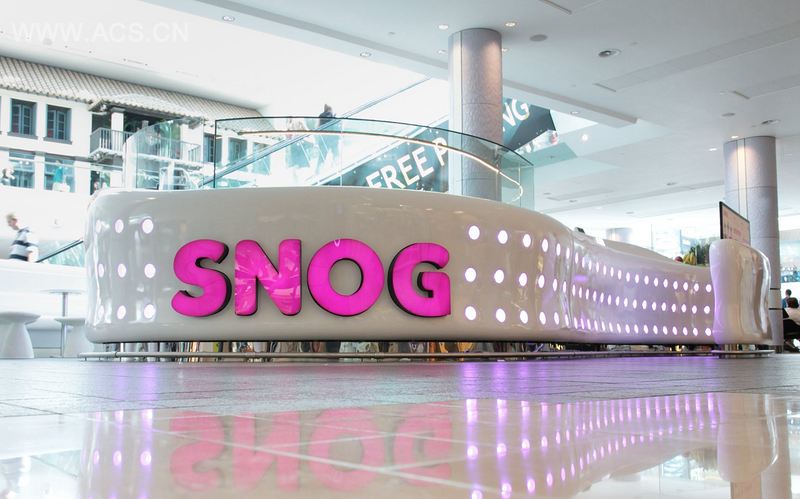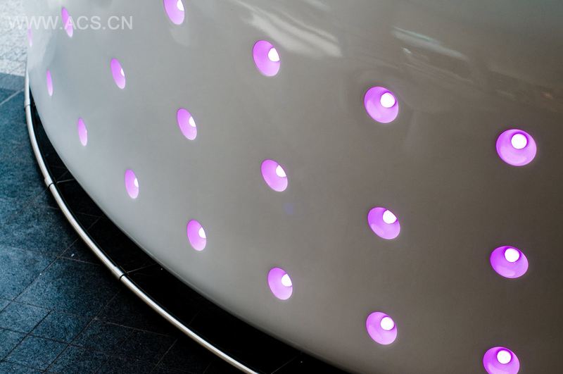 最初的设计构思是营造一个流动的有机的造型,镶嵌上完整的照明设备。主体售货摊的外部表皮的设计灵感来源于高尔夫球的白色光亮凹凸表面。高尔夫球面的简洁和美丽具有真正吸引人的美学特质,通过将此运用于波形摊位造型的设计中,营造了一种感性的形态,让人们同时享受远和近的观赏。