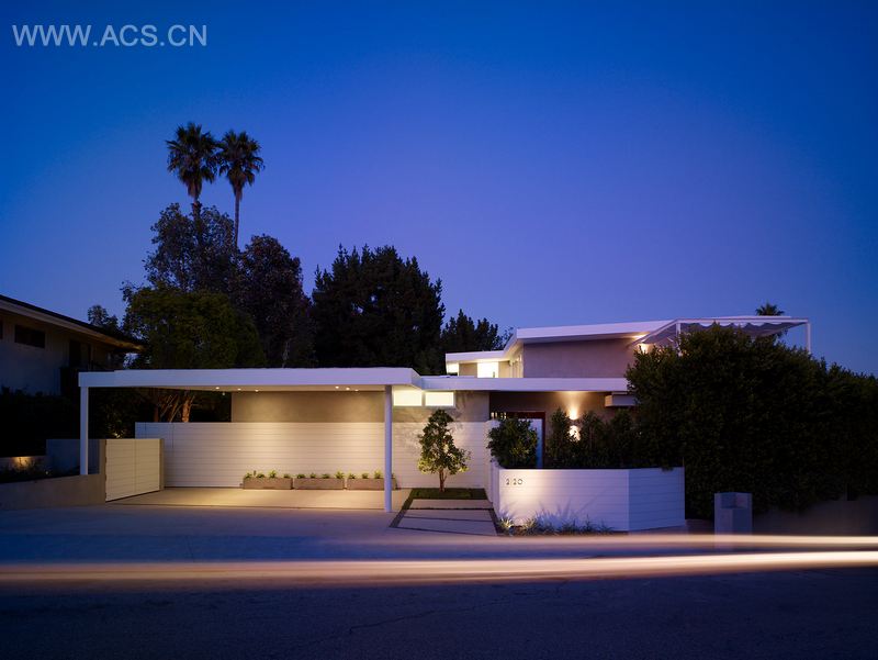 通过外部的空间,建筑师和Venice工作室一起创造统一的室内/室外区域,补充住宅灰色外立面醒目的现代感线条。旧水池依旧保持,但被现代化和抛光,周围的花园重新种植当地的品种。住宅的后面增添了一个草坪,为业主的孩子提供柔软的玩耍区域。客厅和餐厅的阳台被更新,反映前面新入口大规模的水泥铺筑材料。这里,柚木休息厅家具为观看洛杉矶市中心的天际线提供了 一个理想的地点,屋顶上的垂悬物伸出来提供阴凉,并框下洛杉矶市中心的天际线。