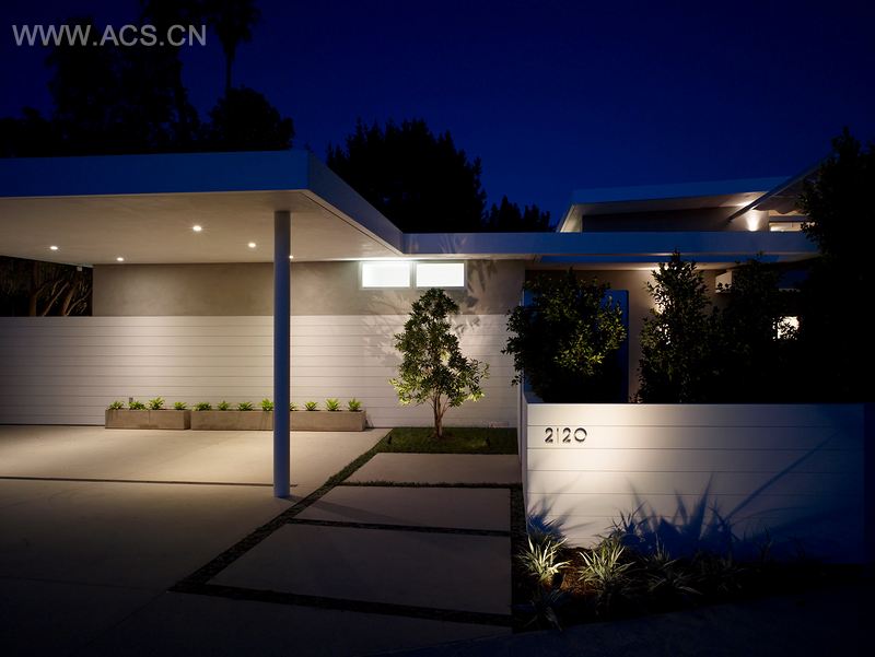 在路边,就能看见一个新鲜的、发光的家正在迎接游客们,它的灯光、中性色调和大胆的水平状态让它显得非常迷人。Montalba用粗的、白色的水平勾勒加强外立面的水平姿态,现代化和强调这个存在的楼房的屋顶平面。清新的车棚去除了一个冒失的独立式车库。这删减让住宅有机会以一个通风的入口欢迎访客和携带丰富的自然光线深入内部空间。大规模的矩形混凝土铺路材料排列的车棚和路径下面,视觉接触但相见;堆叠的白色混凝土板墙板水平排列在前面的场地和车库,来建立一个在整个住宅中流动的节奏。整齐充满活力的人工绿色植被和一个光泽的不锈钢铁门保障安全,但不会给人坚固的感觉。