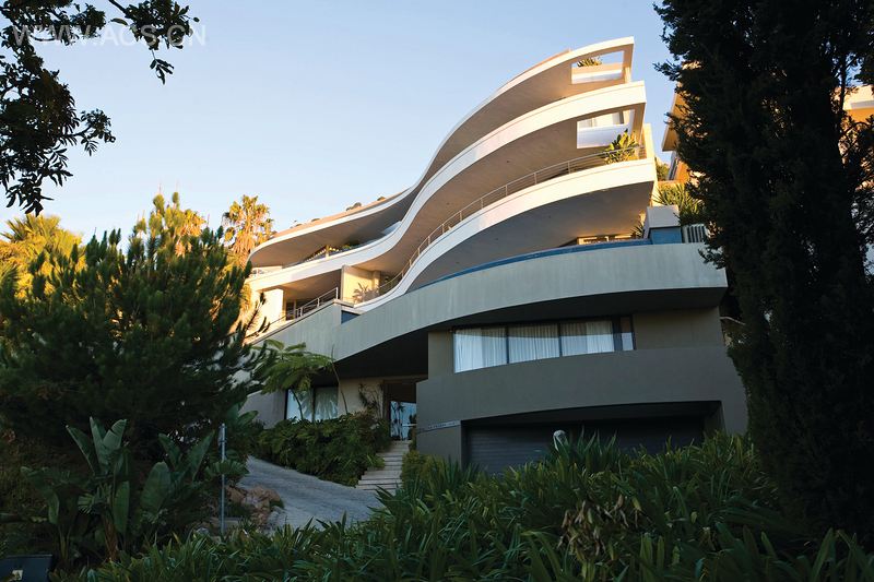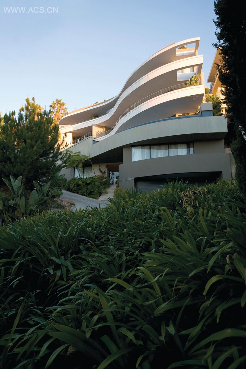 Stefan是一个以为变化多端的陡峭山地场址设计住宅而著名的建筑师,他欣赏这个挑战。“这可能是到目前为止,我遇到的最难的项目,”他承认,“这个场址是一个三角形状的,因此我想出一个尽可能多利用空间的设计。”结果,他设计出来的是一个起伏的、波状的建筑,有着富于曲线美的阳台,充分利用了场地的限制性因素。最终完成的建筑纳入了Stefan双水平的楼顶房屋,包括一楼的两个套房卧室、客厅、厨房,底层的工作室、一个套房卧室、车库,以及地下层的一套公寓。在屋顶上——通过主客厅的楼梯可到,是一个私人游泳池、阳光露台、挂帘的四根帷柱的阳光床和一片参考里约热内卢的景致。