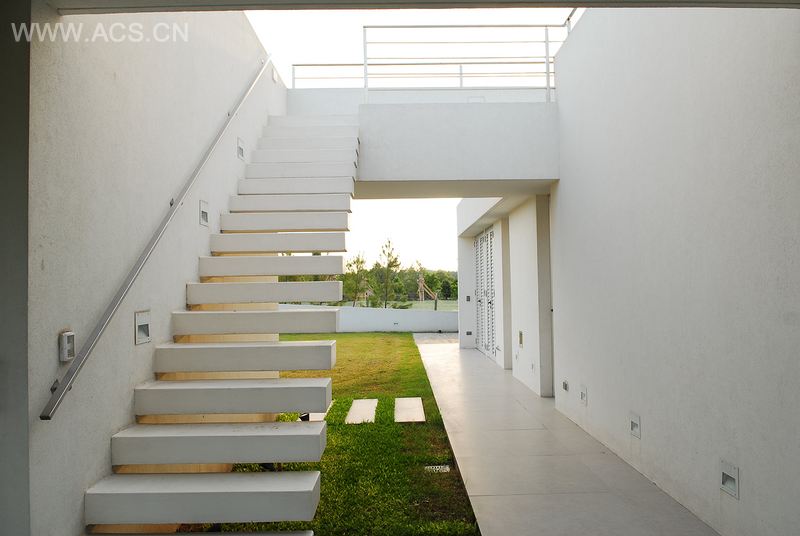 从两层楼高的中央大厅移步,经过一座与相同材料的楼梯相连的钢铁和玻璃制成的桥便可到达露台。