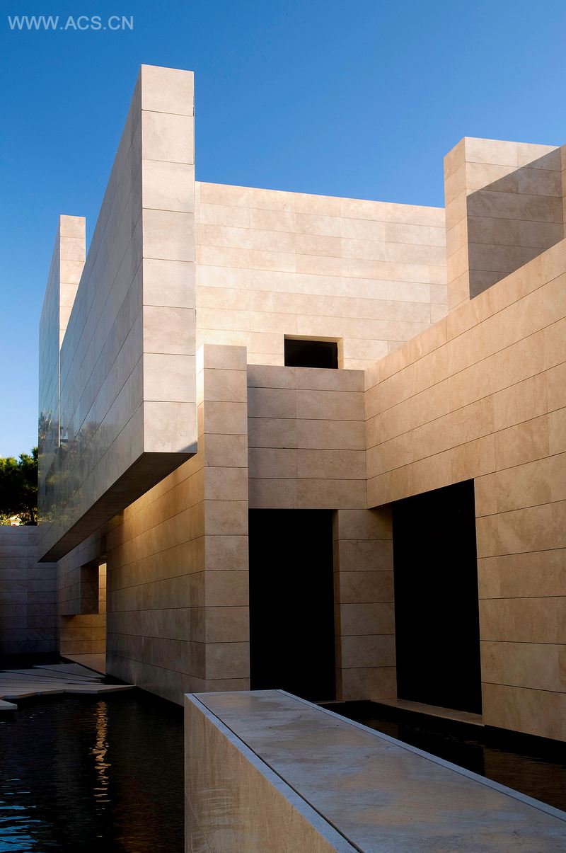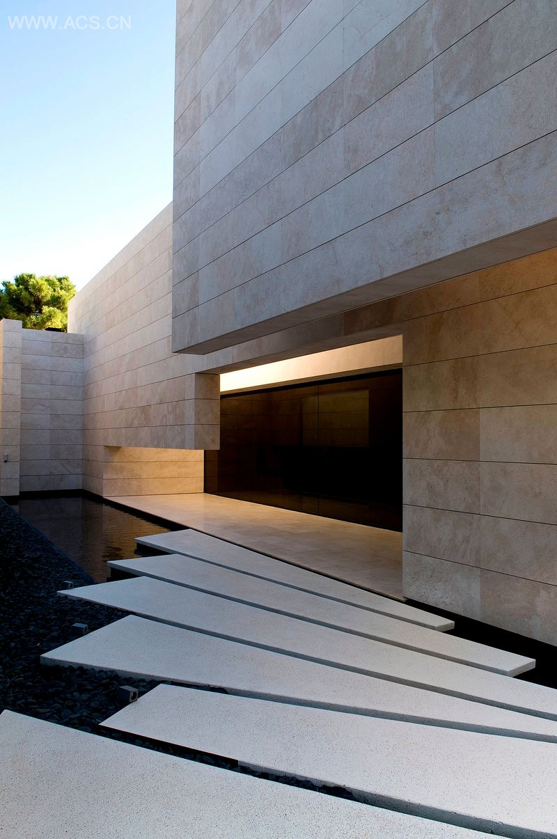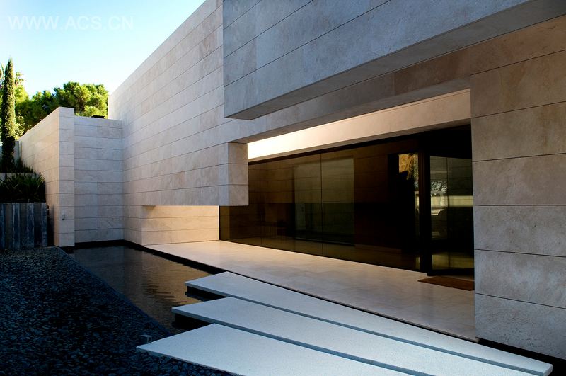 北面外墙坐落于房屋的通道处,从建筑学角度来看,更沉稳而有力。一个几何形状的通道覆盖着一层水,直通大门。窗户也许对房屋的美学效果来说是次要的,但是对于走廊和公共空间的采光来说至关重要。