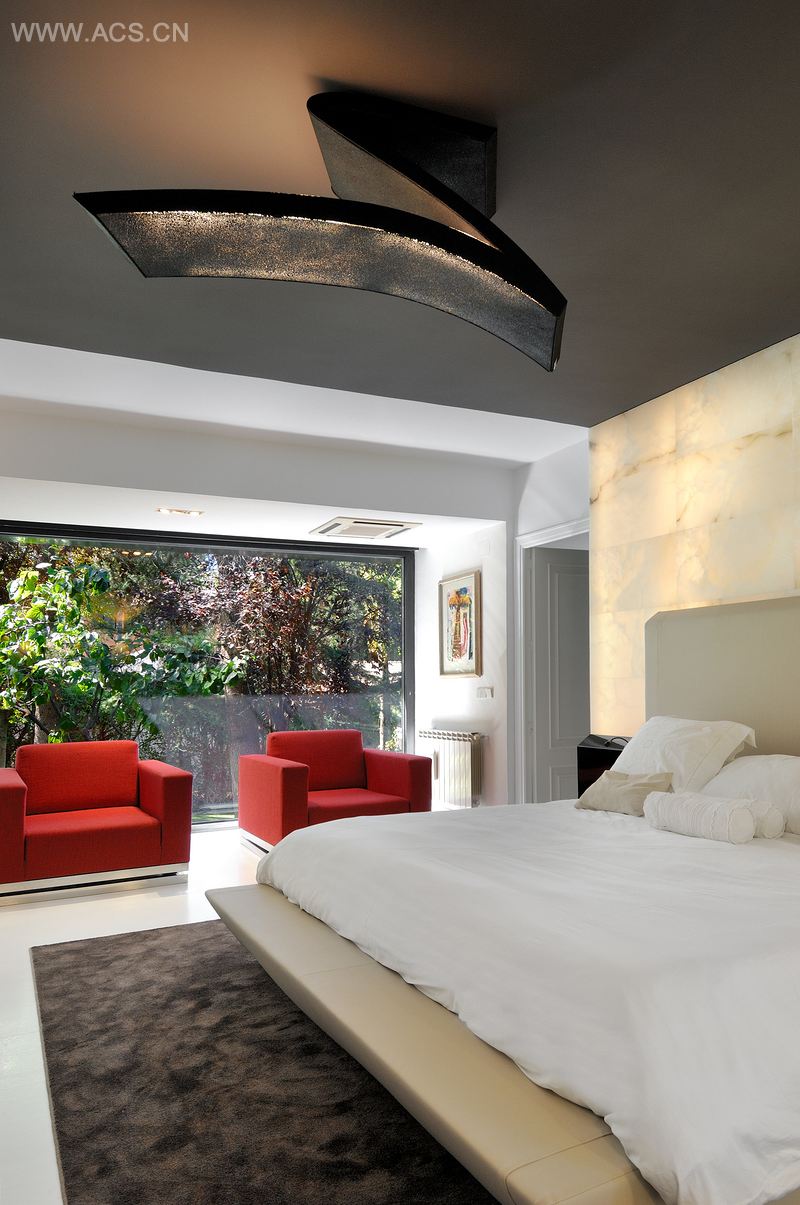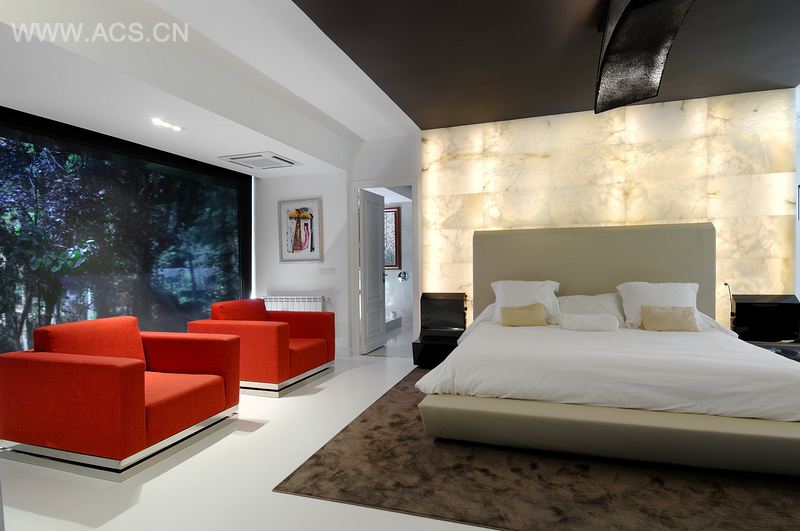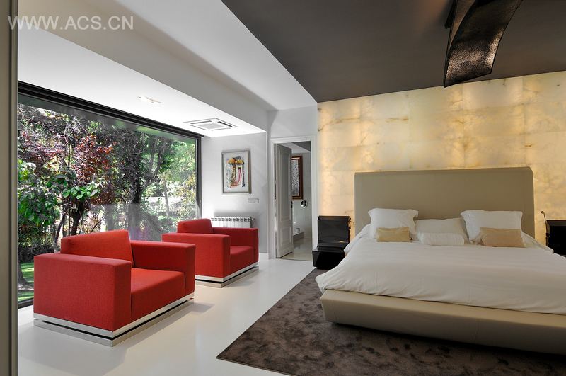 住宅里的家具也是由A-cero设计。偶尔几处褐色装饰打破了白色空间的单调。家具业遵循这种色调。卧室的设计营造了温暖而不失现代的氛围。