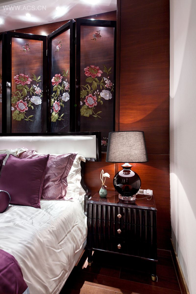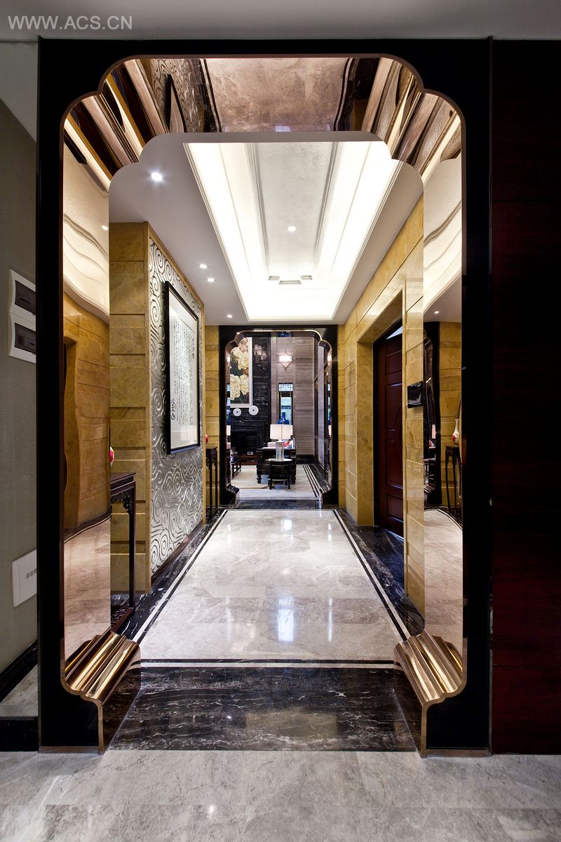 温暖的氛围、岁月的沉淀、精砺的质感,这些都是设计师企图在长辈房表现的要素。从人类所谓通感的诉求出发,设计师利用水晶的剔透、陶瓷的温润、木器的光泽、时钟的稳重感来触发人的类似感触,一隐一现,张力十足。整个长辈房空间的暖色让人有时间变缓的错觉,佐以屏风微展,茶具闲置,一切都充盈着安逸、满足的感觉。主卧中,祥云图案以一种立体的方式被运用到天花、地面及墙面,交错分布之下有微淌的即视感,传统元素得以用一种现代的方式来表现。设计师用线条来表现鎏金主题,选用的各式家具都饰以描金线,软装构线线也呈金色,随时间推移,入射阳光产生相应位移,房间内的金色也仿佛流动。设计师将卧室内布置得古香古色,形成特定时光感,希望呼应流动的金色,鎏金亦化为流金,予人流金岁月的联想。