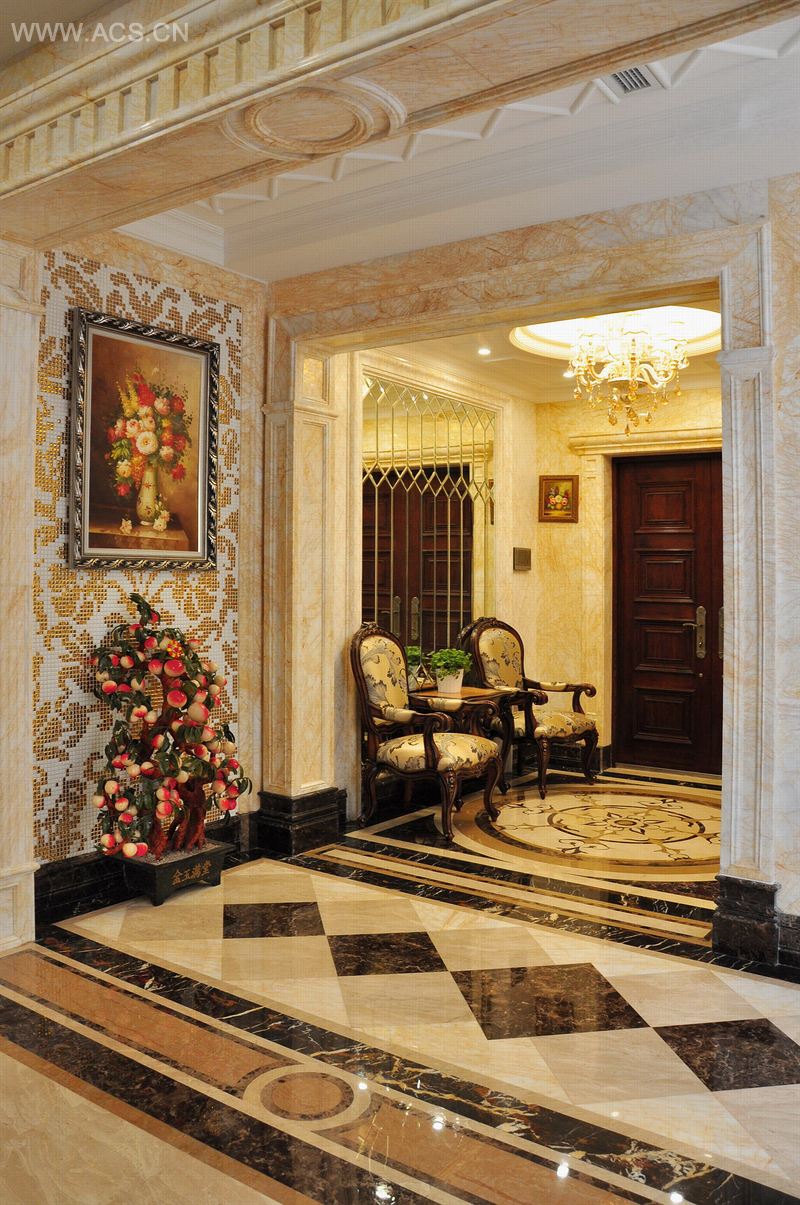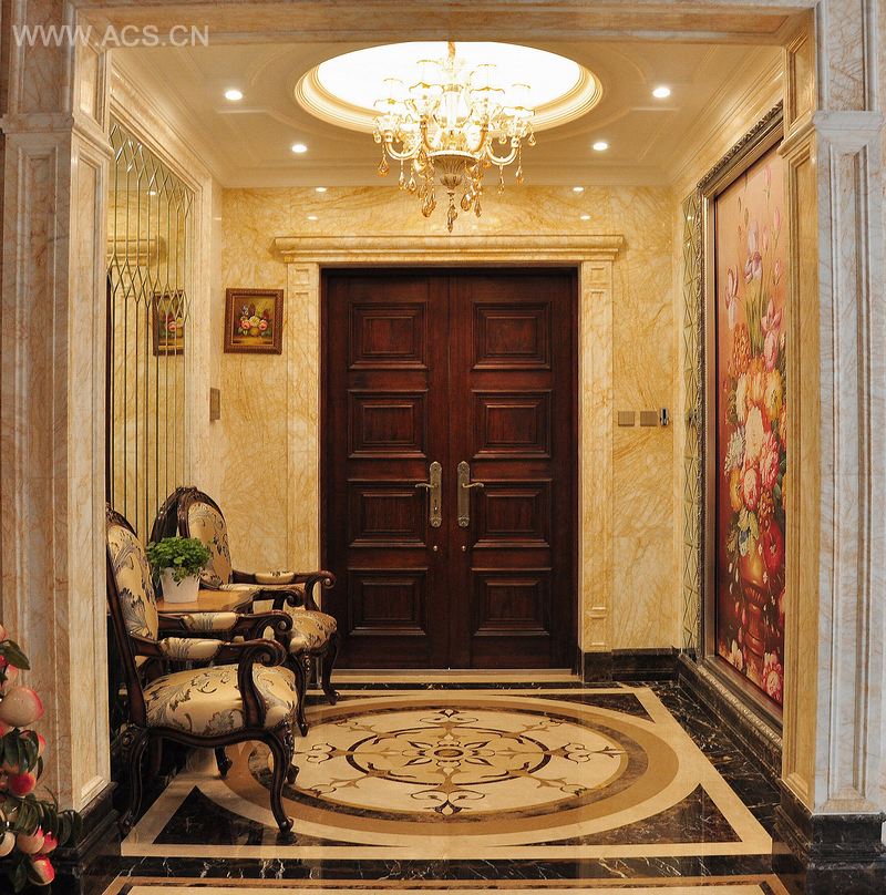 在家具的选择上考虑到风格的体现,选用了圣佛朗风格的家具,使整体空间更加彰显出大气。在材料上同样考虑到风格等因素,运用了一些理石和实木的材料,把空间这种霸气的感觉表现得淋漓尽致。