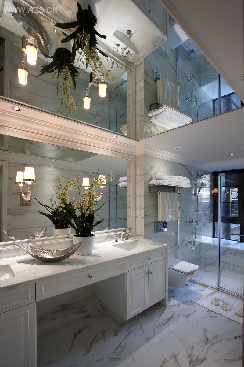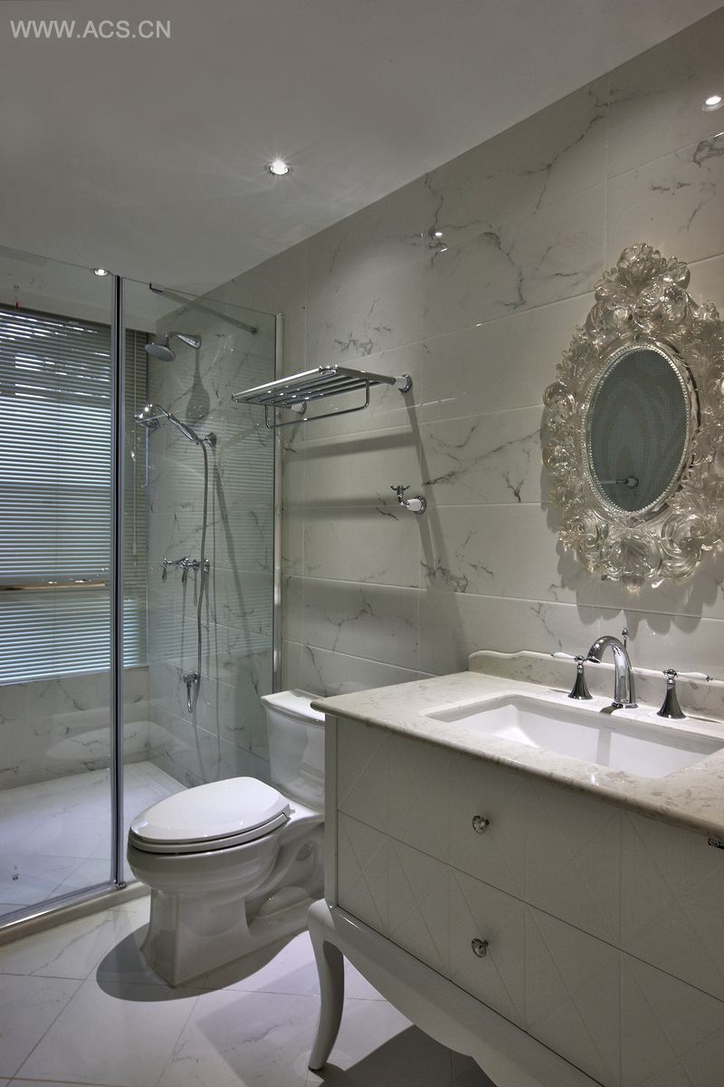 设计师以简欧风格为主调,配合后现代主义美式家私的新古典元素,抛弃多余繁冗的堆砌装饰,极力还原一个简白亮丽的纯色空间,米色加白色以及少量黑灰色彰显极简主义的凌厉果敢与美学韵致,大量使用仿雪花白白大理石、玻璃马赛克、白色仿皮革质感的涂料等偏现代装饰材质,符合时下现代人的审美视觉,目及手触之处都是玲珑一片纯玉白。
