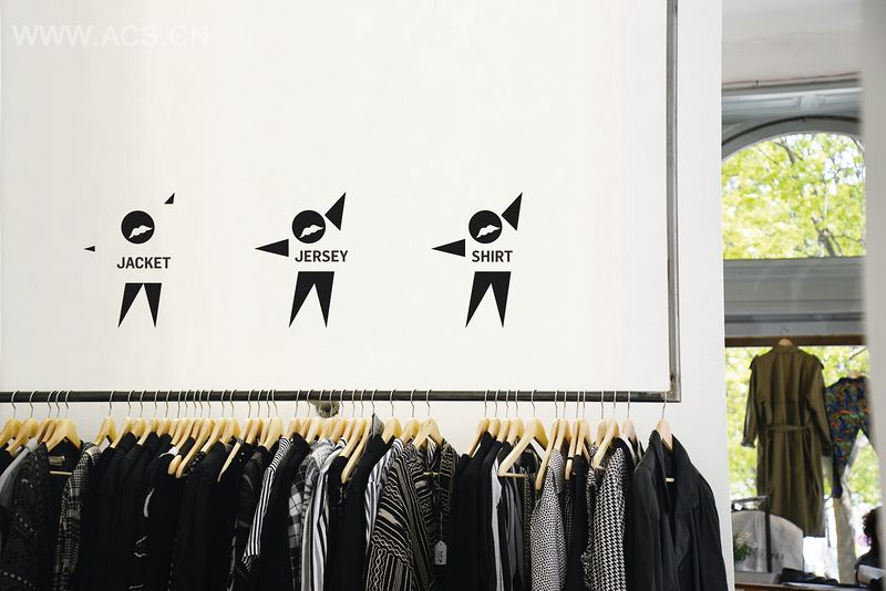 我们面临的挑战是为这家服装概念店设计一套导向系统,不借助文字但要让客户能够方便找到相应服饰。它必须通俗易懂,一目了然。这一套指示系统用了两个主要标志:一个针对女性,一个针对男性。每个图标都指出身体的部分,以此指代服饰的适用范围。这些图标同时也是店面设计的一个元素。整个导视系统没有使用其他色彩或是其他相异的元素来构造。