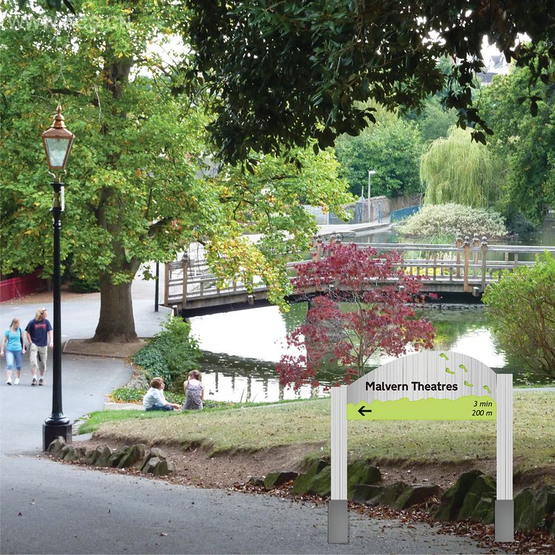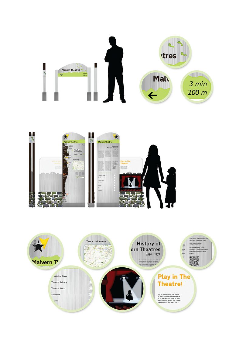 The main materials used for the signage are l and wood, as they are considered easy for maintenance and also convey a more natural look that suits the town’s nature. The colours and shapes are inspired by Malvern and the Hills and their charming fresh atmosphere. Avoiding the sound effects for the Interpretation board, as well as the additional night illumination for the signage system, solves ecological problems such as light and noise pollution. However, in order to improve the late tourists’ experience, a phosphoric paint may be used.