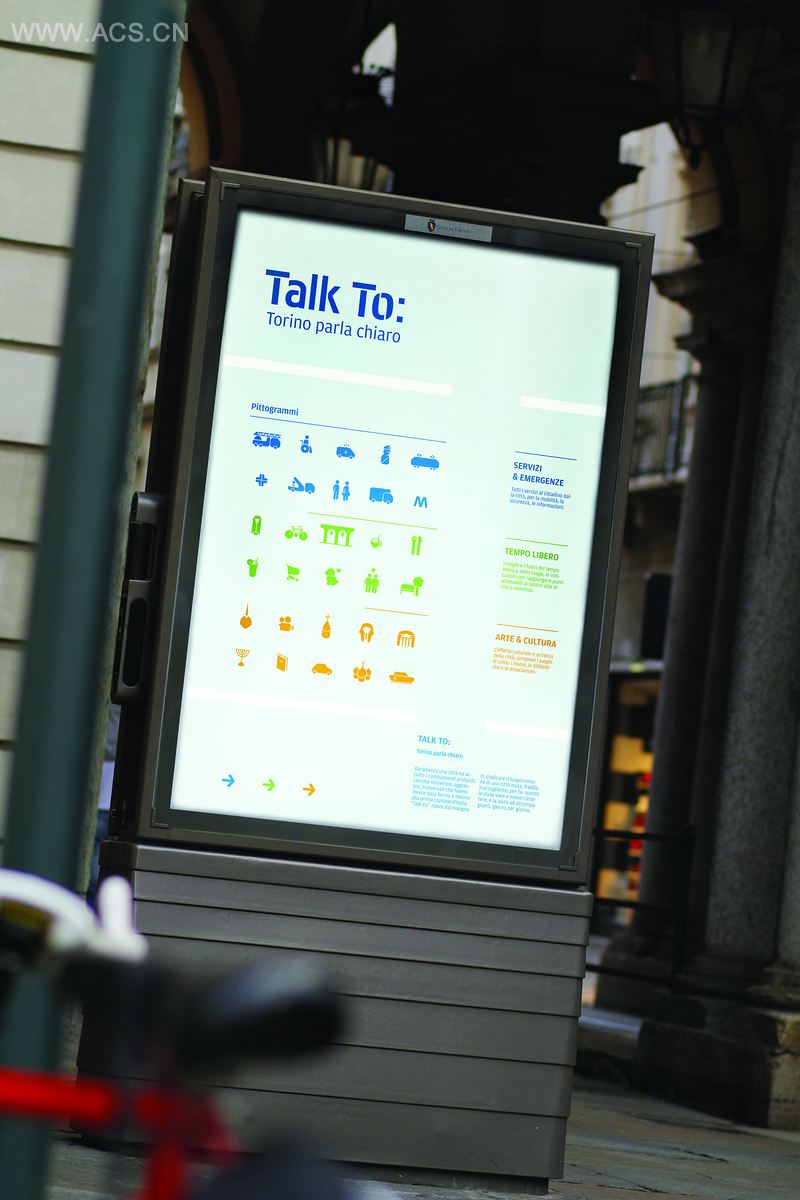 Talk To是欧洲设计学院(都灵)平面设计课程的一个项目,它为行人设计了一个微观的标志系统,在该市的旅游点内引导行人。项目采用了定制的象形图和字体,设计语言和图案都体现了都灵的特点;使用三种颜色来区分三大领域:橙色代表艺术和文化,蓝色——服务,绿色为休闲娱乐领域。整个“Talk To”系统的设计能提供最即时、灵活、侵略性更弱的导向服务。项目在试验阶段时已经在都灵的Barriera di Milano区得以使用。特别感谢的是Piero De Macchi教授在Retrobottega粗体字设计过程中提出宝贵意见。