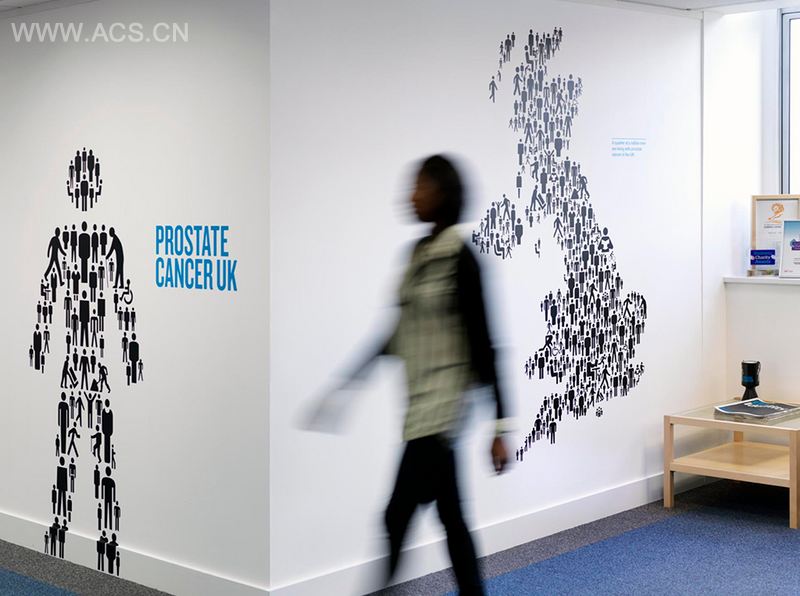 由于前列腺癌被预计为2030年最常见的疾病之一,英国前列腺癌中心希望能建立更鲜明的新形象以获得更多关注。hat-trick从大量不关于男性的不同图标汲取灵感,为它的品牌重新设计了“男人们”系列图标。英国前列腺癌中心的办公室随后在墙上和门上刷上了这些新图标。在英国,9个男人中就有1人有可能患上前列腺癌。因而我们需要向每位男性介绍这个慈善机构的概况。英国前列腺癌中心办事处是推广它的新形象的完美地点,能介绍该组织的新形象和关键信息。我们从大量不关于男性的不同图标汲取灵感,为它的品牌重新设计了“男人们”系列图标。它们反映了患此病的男性数量,象征着男人们正在一起努力找到解决方案。图标还表示了任何类型的男人都可能患上此病。办事处内的图标足有真人大小。此外,我们还设计了一个时钟图案以传递关键的事实,每15分钟就有1名男性诊断出前列腺癌。