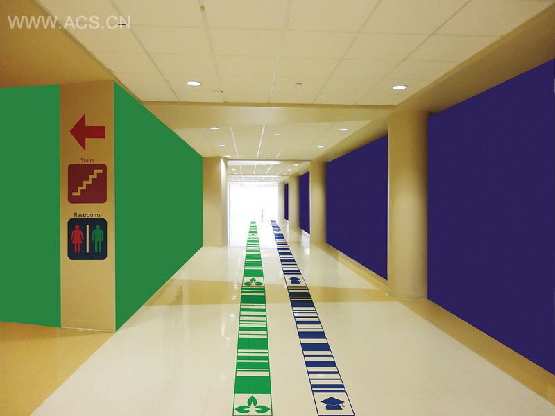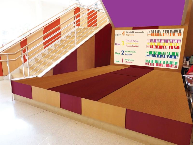 该项目的导视设计使用了基因序列图像和图表。在入口处,首先看到的是基因研究所的logo,借此将研究所介绍给人们。每一个部门的关键处都标记有彩色状的标志,其功能相当于独特的导视装置。为了帮忙参观者准确找到自己的目的地,墙上反复标示着指示牌。