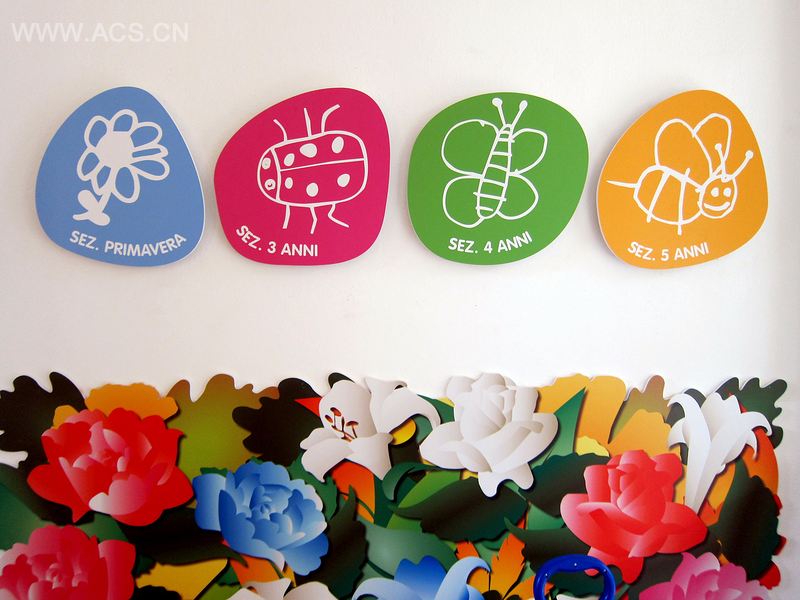 我们自己绘制鲜花并将它们印在板上并进行数字切割。每个教室都通过不同的颜色和花园常见昆虫来区分。