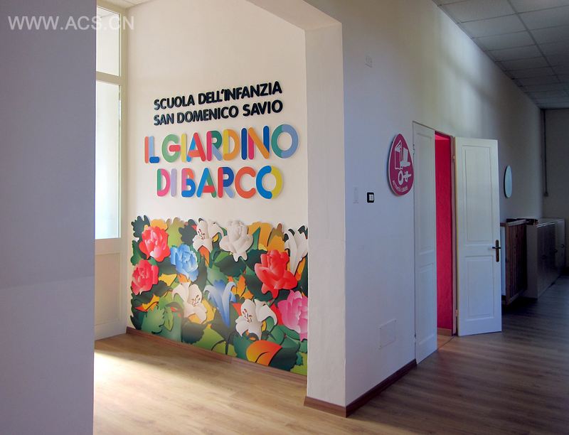 这是对意大利巴可一家始建于1920年的幼儿园的Logo、导视设计和视觉形象更新。原本建筑外立面上的 “GIARDINO D’INFANZIA” (Children Garden)文字依然可见,这也是这间古老的幼儿园的教学理念。我们决定尊重这一理念,将学校重新命名为巴可花园IL GIARDINO DI BARCO (The Garden of Barco)。所有的设计都应该让人联想到花园,因此我们使用了许多的鲜花。Logo和导视标识也被鲜花环绕。