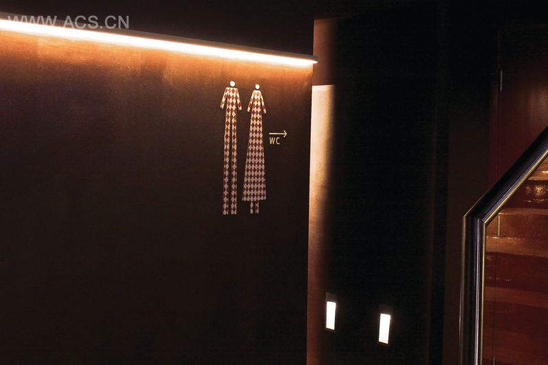 Circus 酒吧位于一栋沿河的两层建筑中。作为一个人们相聚饮酒跳舞的场所,导视系统更多的是作为一种室内空间支持。因此,设计公司制作出一些抽象的图标作为导视标识。例如,设计师在卫生间的门上采用手形楼梯和绞手架,或是圆形动物图标。