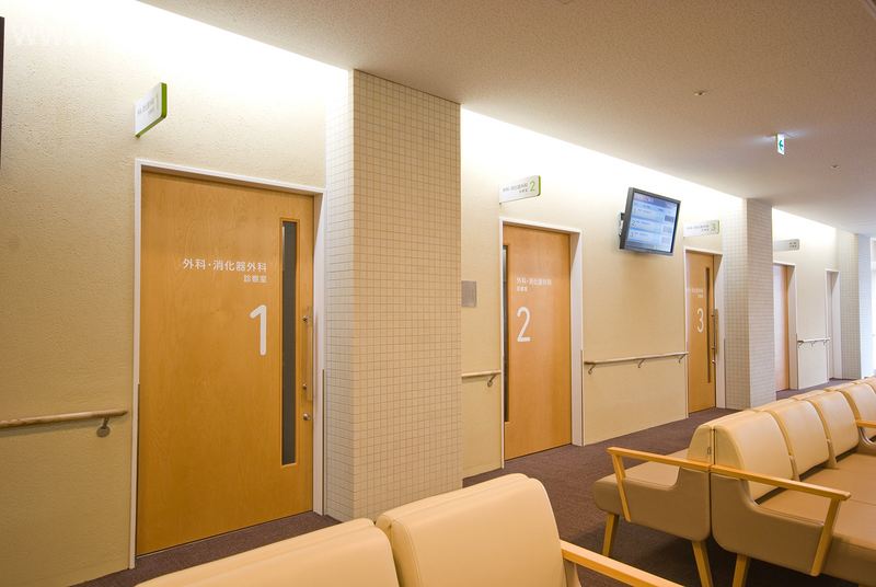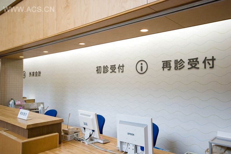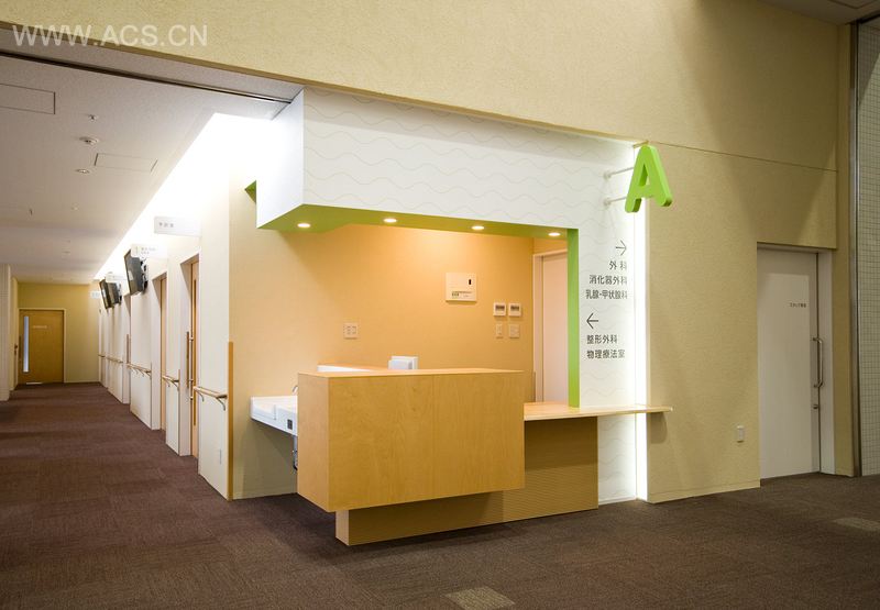 对于综合医院而言,运用颜色来引导人们去往不同的部分非常关键。但是这个医院的室内空间非常柔和并使用了木头,颜色标识并不适合这一类型的空间。因此我们设计出两种不同颜色的带波纹的图案,来代表医院窗外的山和河流。我们使用这种绿色和浅蓝色来传递医院的整体形象,不同颜色的波纹来代表不同的部门和病房。
