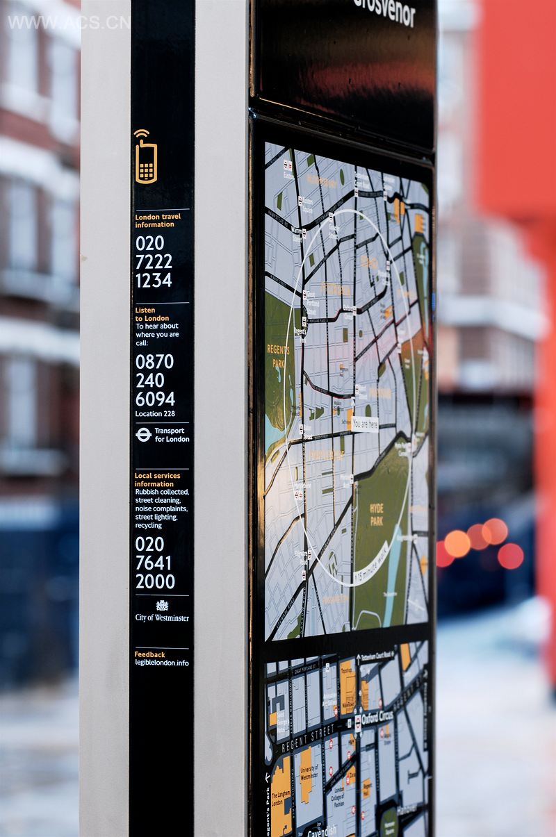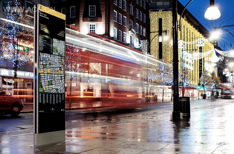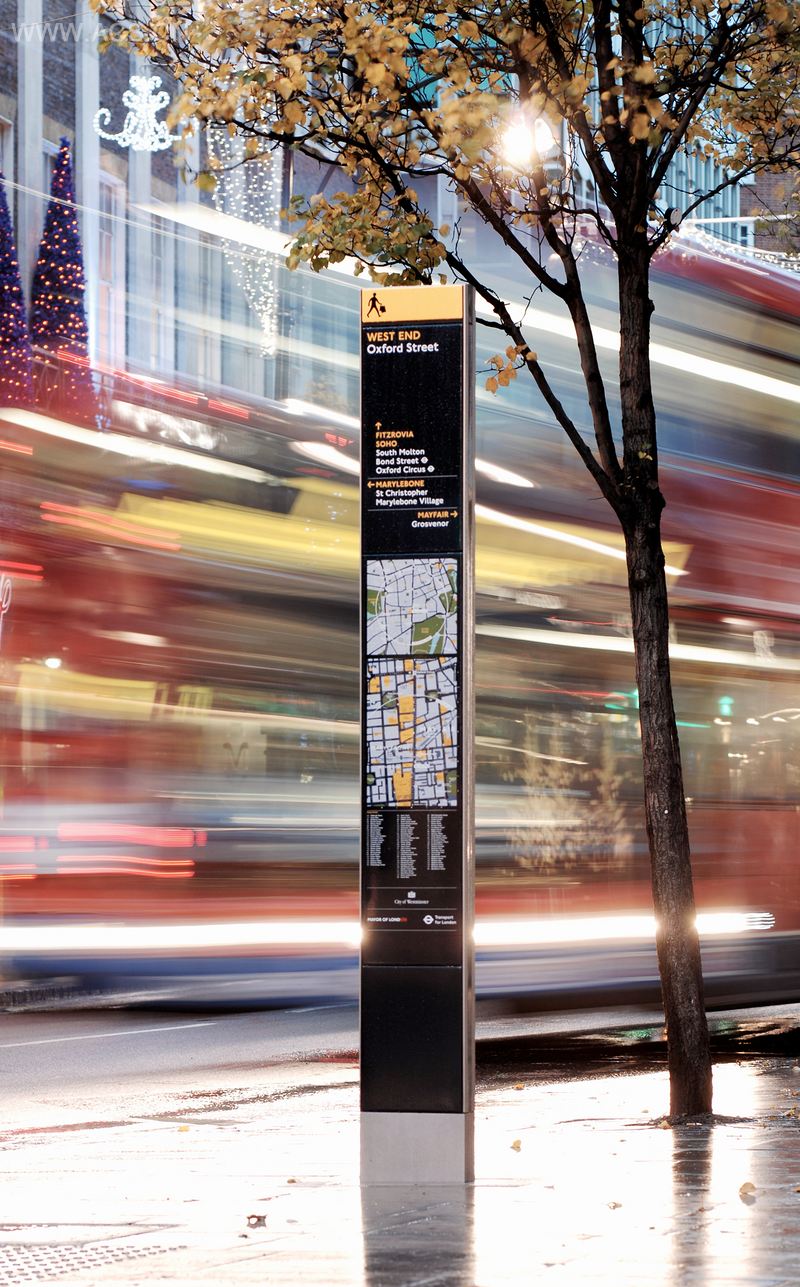 “清晰伦敦”导视项目尝试规整各个街道,并为城市提供连贯的导视策略。这个计划在邦德街进行试点,包括19个高科技、互动式“对话标识”,这些标识除了传统的信息展示外还提供额外的拨号服务。由Applied Information Group (AIG) 和Lacock Gullam设计、Woodhouse制作的地图带有直观的“指向”标识,它们直接指向目的方向而不采用传统的南北轴线。这个地图比无处不在的地铁线路图更为准确,标出了有名的地标、人行通道和道路。