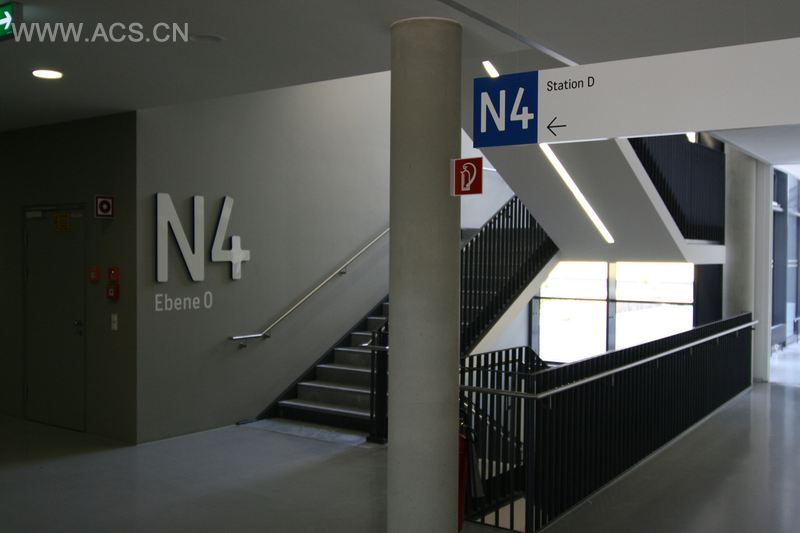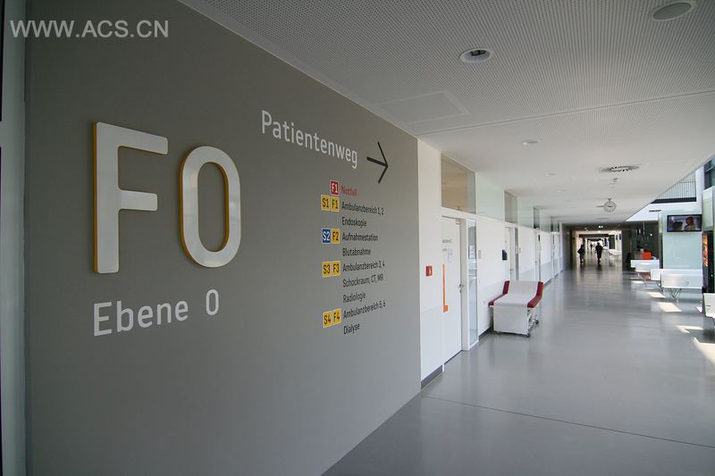 本项目是为中欧最大的新建医院之一设计的色彩导视系统。整个系统立足于中心枢纽处,这里引导着病患和访客通往医院的各个角落。特定的颜色划分出不同区域并形成一个快速导向系统:运用在地面上,并被使用在字体和背景色上,它们引导着从停车场到病房的道路。字体有着强烈的对比度并间隔紧密,加大的字体能够方便老人和残障人士辨认。