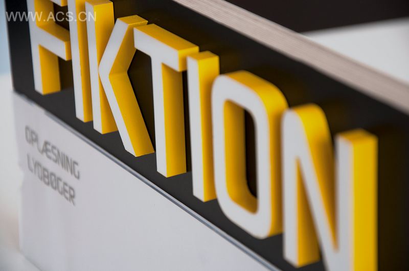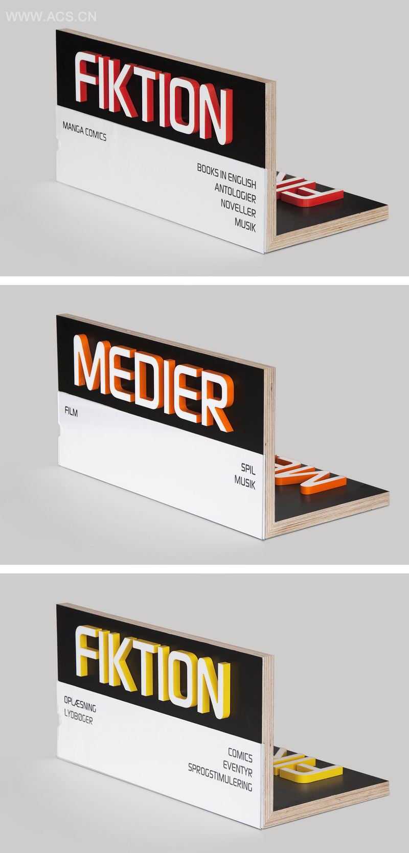 这个设计包含一系列雕刻板标识,在图书馆主厅的多个角度和水平上均清晰可见。这些标识由胶合板和丙烯酸切割字母组成,字母刷上了不同的颜色,来与图书馆的视觉形象相对应。