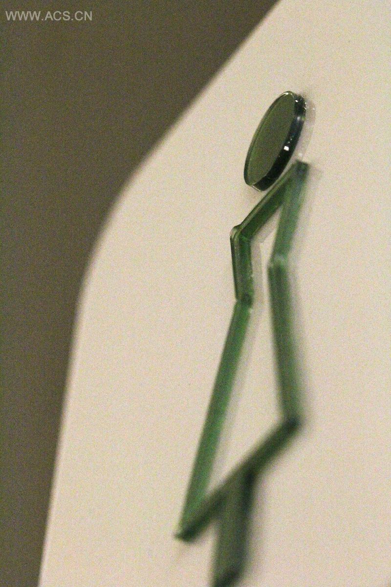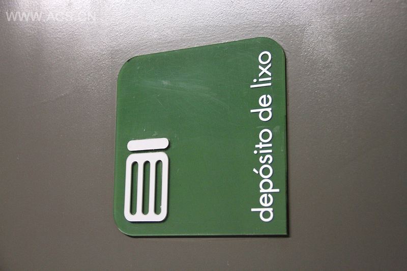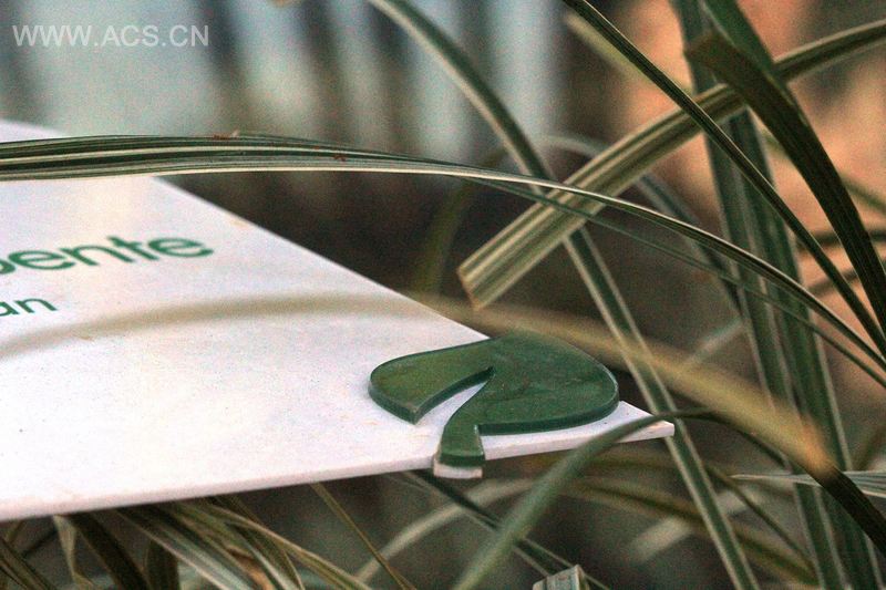 而标识设计也依从这一绿色建筑标准。我们采用回收的PET瓶作为原材料来制作标识板。形式上考虑到建筑设计本身的当代风格和高科技细节处理。这就是为什么简洁的设计更受偏爱,同时也能反应出设计的主要理念——对环境的责任感。标识板3个角为弧形,一个角为直线,能够让人联想到树叶的形状。颜色选用PET瓶本身的绿色以及白色。