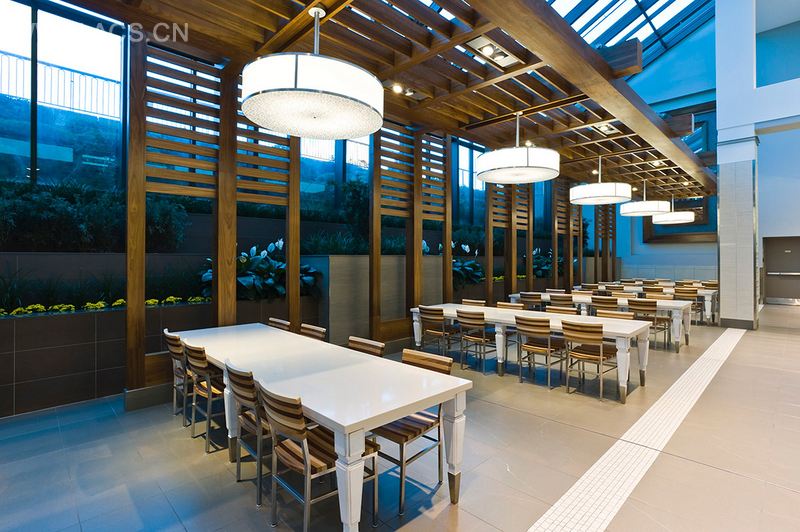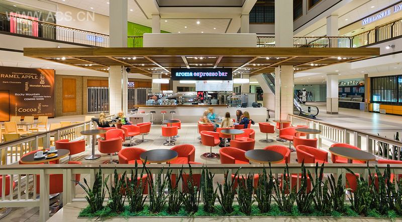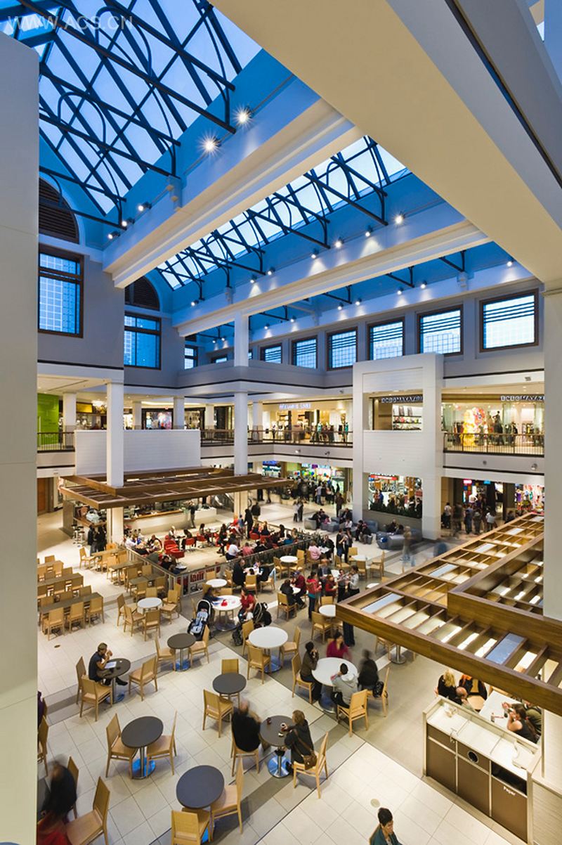 皇后码头国际建筑有限公司在2009年完成了位于安大略桑希尔普曼娜购物中心的翻新设计项目。这个现代化的购物中心完成了多种转变,其中,入口、顾客服务区、公共区和美食广场都有所变化。该设计旨在为参观者们营造出一种休闲的购物氛围。