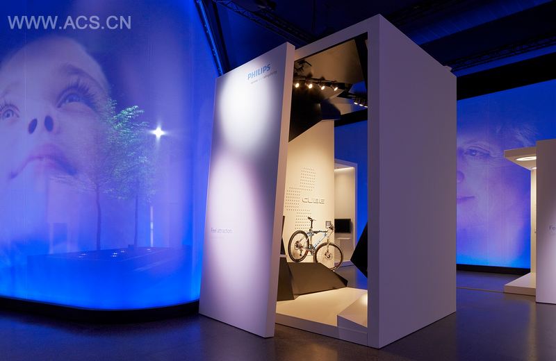 展区中心是一个结构明亮的膜状物,不同的亮丽色调以及视觉氛围交互运用,加上声响装置的配合,渐渐将单一灯光氛围的效果扩展到整个飞利浦品牌空间。灯光、音乐和颜色的同步运用使得光波实现统一,因此展区的设计表达了灯光作为决定性建筑元素的理念。