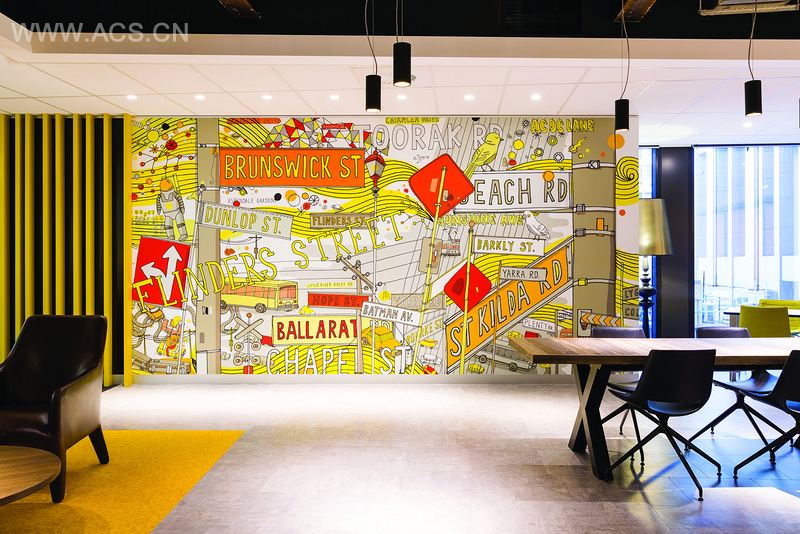 工作范围包括标牌和导视设计,沿着超大型的环境平面背景墙为这个位于市中心的办公室新增了明显的墨尔本特色元素。