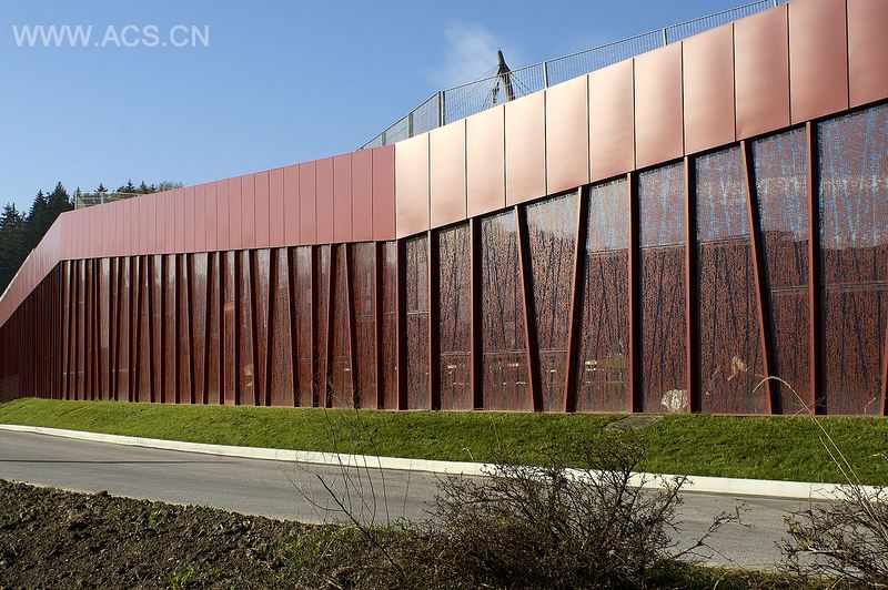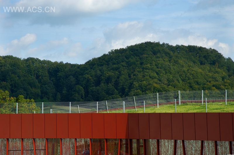 由于建筑的体积会鹤立鸡群于周围的、主要是乡村风格的建筑中,它的设计便非常内敛。从前面的道路扫一眼过去的话,建筑物看起来几乎像一个栅栏,保护着水疗建筑组群的空间。新设施尽管抢占了毗邻马路的面积,但没有占用泳池附近任何有品质的空间。屋顶种植着绿色植物,并可作为大众通道。通过这种方式,新获得的区域与一部分被挖走的地面地形互补,并提供全新的、不同的空间体验。绿色屋顶是折叠的,它似乎由于种植区域的融合,自然地向周围景观延伸。