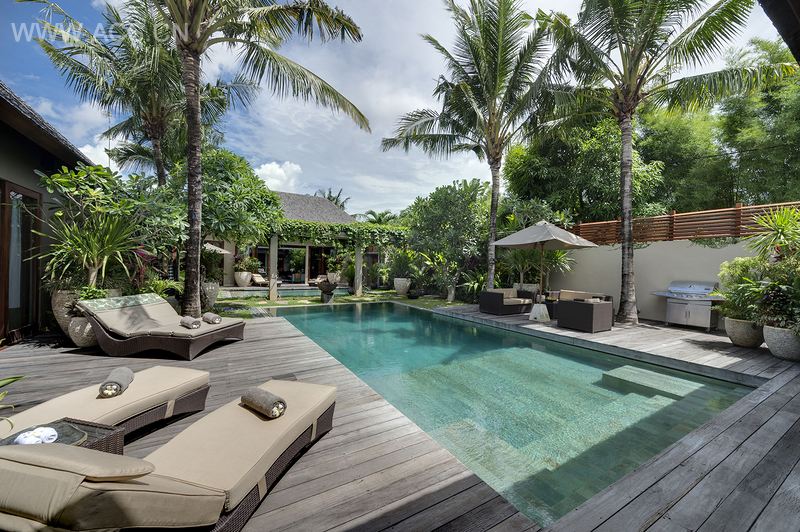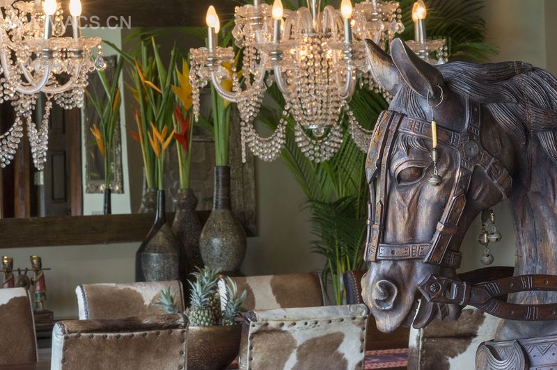 室内设计的魅力无可置疑,旨在愉悦心情:时尚的陈设、色彩鲜艳的艺术品、迷人的手工艺品和丰富的织物。巴厘女神石雕像吸引着人们进入空间,坐在牛皮椅上,头顶便是施华洛世奇水晶吊灯,上面挂满水晶。户外的草坪上点缀着棕榈树,沿用了热带生活理念。在池边露台上休息,或是在烤炉的摇曳火光下享受浪漫的晚餐,别有一番风味。