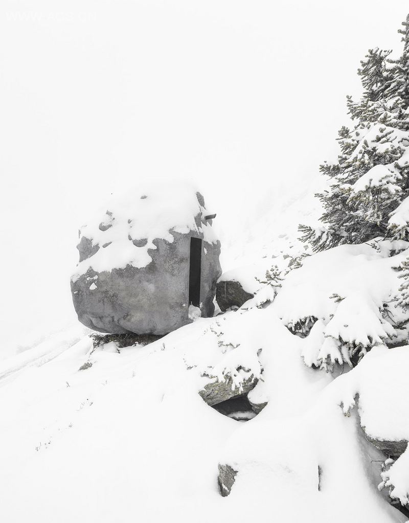 让人着迷的神秘山岭也让人心存敬畏。瑞士人世代与山同居,朝夕相处。瑞士 Charles-Ferdinand Ramuz曾在自己的著作《Derborence》中提到阿尔卑斯山上大量的落石。ANTOINE工作室将高山生活与写作生活结合,设计出一个足够单人使用,隐藏在钢筋混凝土中的小木屋。这个小木屋就如同高山中的落石,或者完美的隐藏型军事构建。立于山中,自由出入,却又极其隐蔽。建筑的基本元素:火炉,床,等,桌,窗一应俱全。