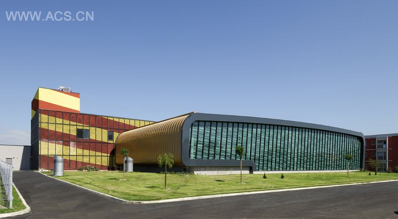 游泳馆动态的体量使人联想到水滴的形态,室内光滑的木质铺面柔和了来自泳池水面的反射光线。位于背后的主要体量体现了方案的层次;彩色的多空金属网表面柔化了生硬的线条。北侧,屋顶横跨整个体块,保护下面的区域。