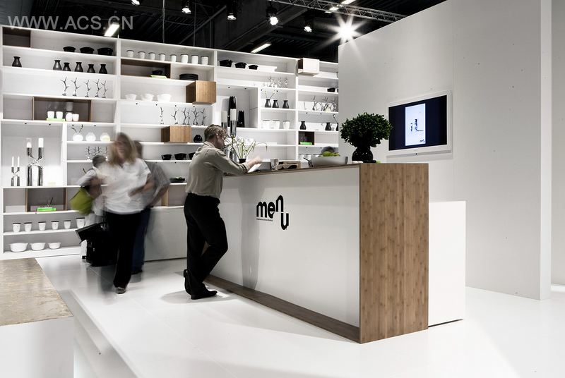 展区由六个非常高的自由立柱组成,架子安放在一边,另一边则是大型图文。立柱的对面是一面大型架子墙,将会客区从繁忙的展览区中分离开来。墙的外部装有大型商标图形,使得展厅在远处就能映入眼帘。展厅中心的大型地面展览展现了一系列MENU的黄金产品。封闭的储藏室使展厅中心显得更繁忙。
