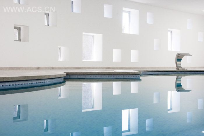 温泉泳池的屋顶有着许多方形开口,光柱如同彩雨般密密倾泻而下,形成完全的治疗,舒适,自然的氛围。