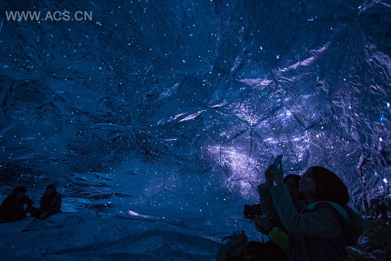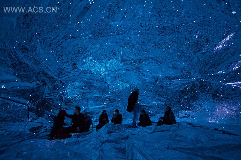 效果,人们进入黑暗的球体后,从外面透进来的光让穹顶猛然看起来像是无限星空,在放上小曲和配合投影,让人们在其中能够放松的凝视。该装置也契合