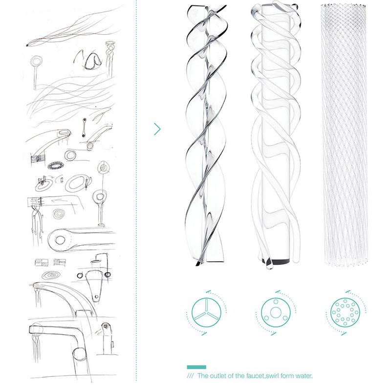 水有滋养万物的德行,它使万物得到它的利益,而不与万物发生矛盾、冲突,故天下最大的善性莫如水。“温润”与“涡旋”是我对水的理解,并将其表现于造型之上。