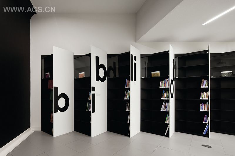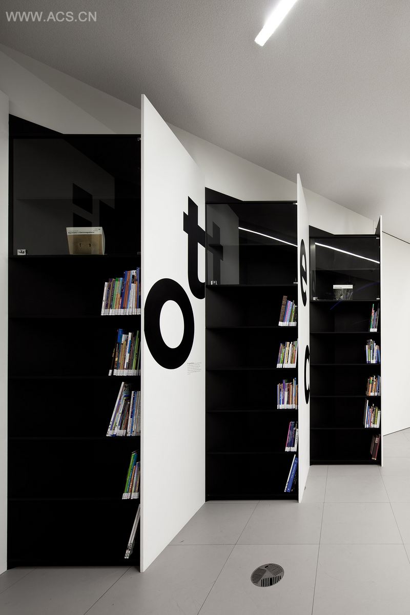 设计者有意将这些书籍隐藏起来,以摆脱图书馆常见的一排排书架,代之以黑白相对的架子,强调着非黑即白的寓意。有着白色表面的架子上,写有两个单词,“图书馆”和“探究”,并附有百科全书对这两个单词的定义,比如“去质疑”、“去了解”,分别有葡萄牙语和英语两个版本。书桌也经过了精心设计,以上过漆的铝材制成。