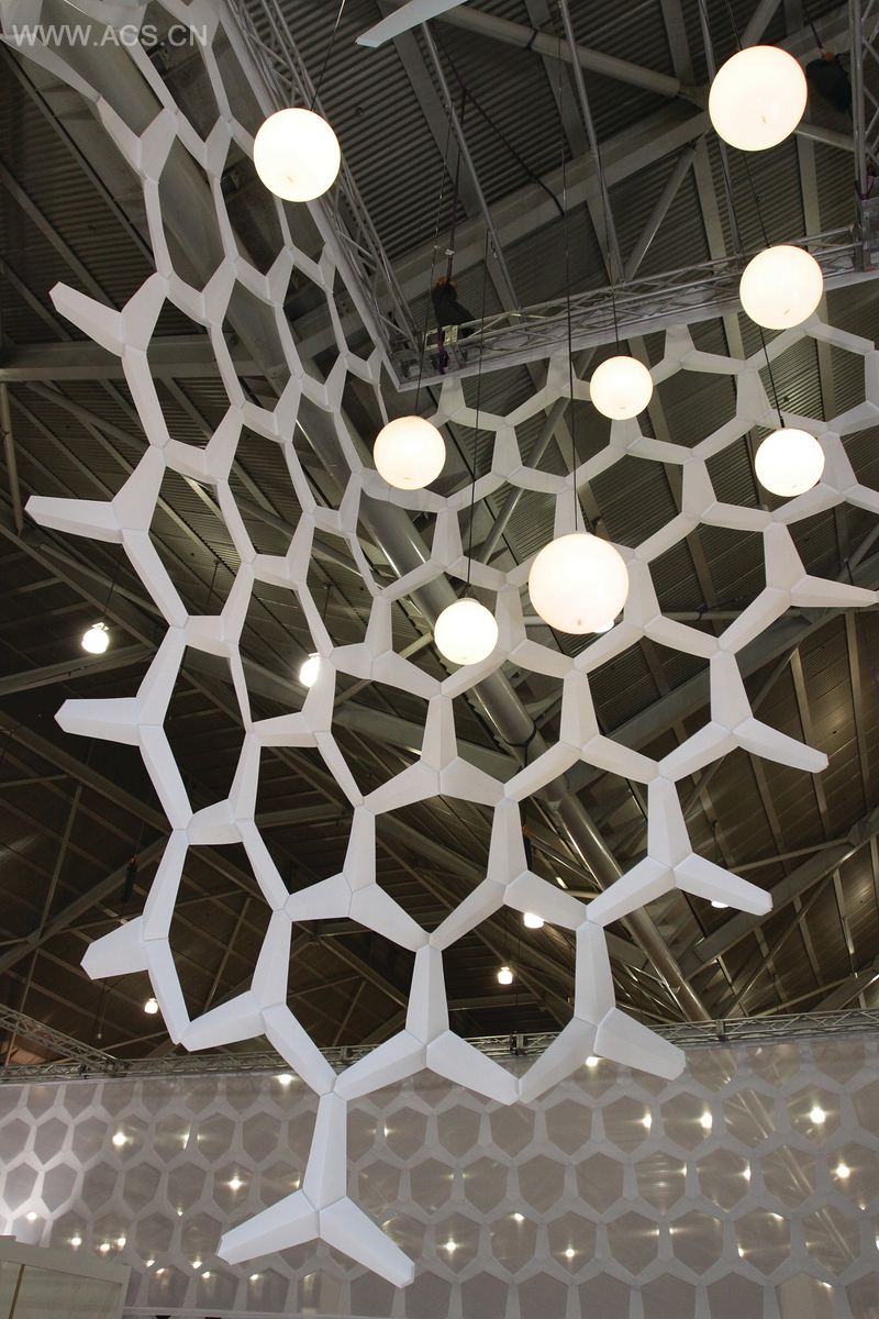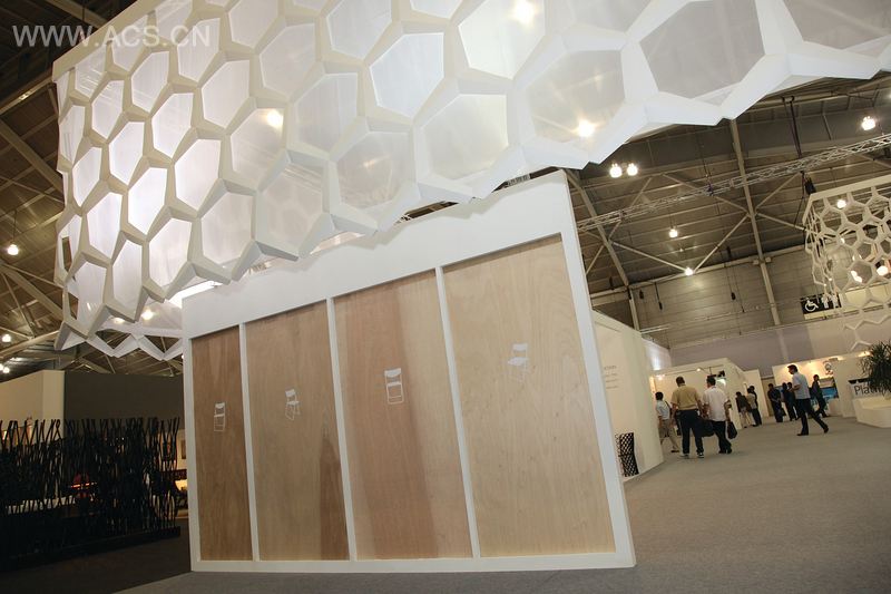 2009年Jarrod Lim Design工作室设计了这个展区空间。在预算紧缩和时间限制的情况下,设计师使用模切纸板拼合成幕帘悬挂于展区中心的天花板上,纸片结合定向照明在空间周围营造出生动的光圈效果,形成了奇妙的、令人激动的氛围。