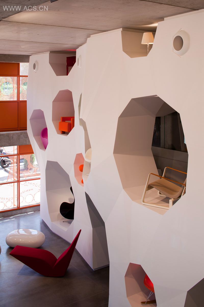 Jakob+MacFarlane工作室是橙色立方和这个展厅的设计师,他们决定使用橙色立方的建筑语言,这种语言以索恩河的流动为基础,在一定程度上把这种动态注入展厅空间。因此,把空间想象成一个立面,一条虚拟的立体河流或是长长的多孔介质墙,孔中装满家具,这面墙环绕展厅空间,呈L字型。观众从壮观的入口移动到更亲密的空间,每个“孔”在尺寸和造型上都是独特的,让观众更亲密地观赏每一件设计。